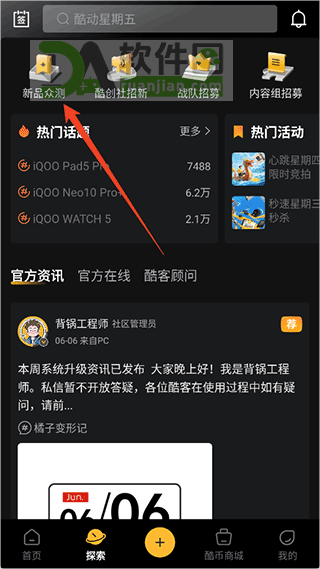 1、打开iQOO社区App,进入底部“探索”页面,在显眼位置找到【新品众测】入口并点击。