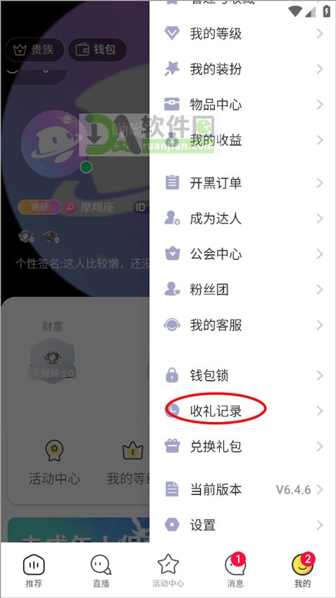3、弹出的侧边栏里,找到并点击“收礼记录”。