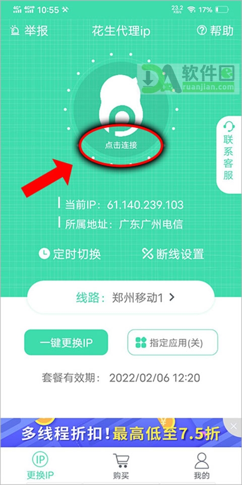3、不想选城市?也可以直接点首页中央的【点击连接】或【一键更换IP】,系统会自动分配一个可用节点。