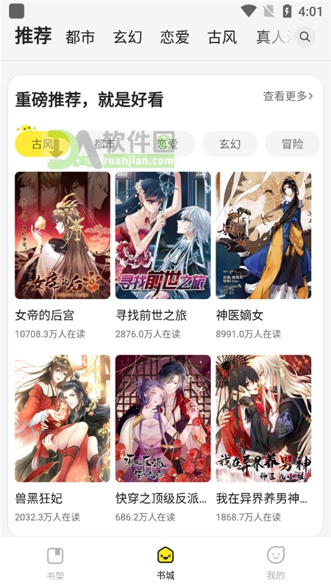 1、打开App进入书城,选择你感兴趣的分类(比如恋爱、玄幻、冒险等),点进想看的漫画。