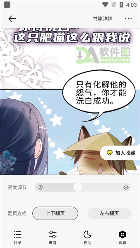 - 阅读设置丰富,包括亮度、背景色、翻页动画等细节调节;