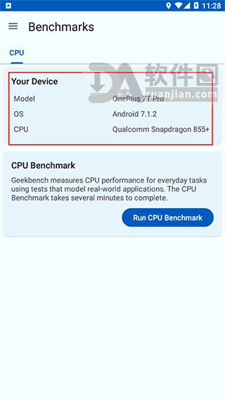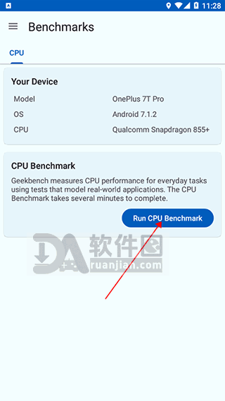 2. 点击“RUN CPU BENCHMARK”按钮,开始跑分测试,期间请勿操作手机;