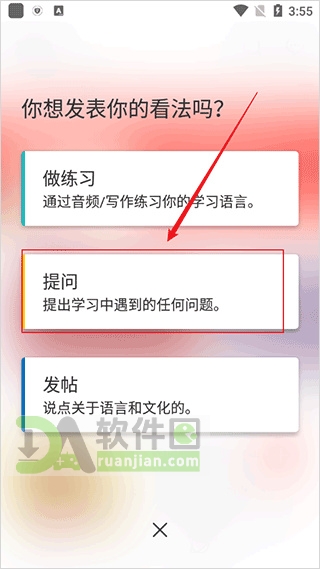 3、接着再点中间弹出的【+】图标,在选项里选【提问】;