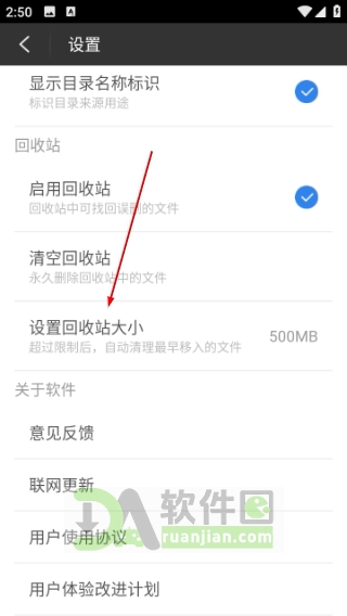 3、向下滑动,找到【设置回收站大小】选项,点击进入;