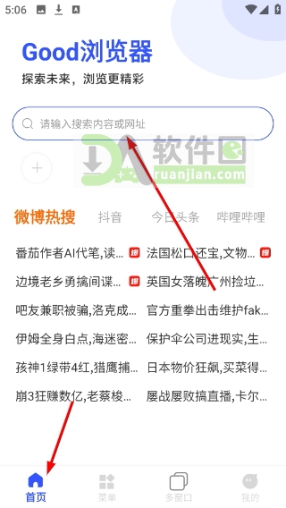 1、打开 App 后,在首页顶部的【搜索栏】直接输入网址或关键词,也可浏览下方的热搜榜单快速获取热点内容;