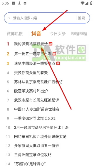 2、点击【抖音】标签页,查看当前抖音热榜话题,点击任一感兴趣的话题,自动跳转至相关搜索结果页;