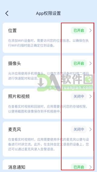4、根据实际需求,开启或关闭如【摄像头】、【位置】、【存储】等权限,完成个性化配置。