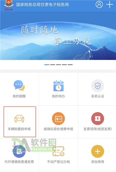 1、在App首页找到“车辆购置税申报”模块,点击进入申报页面。