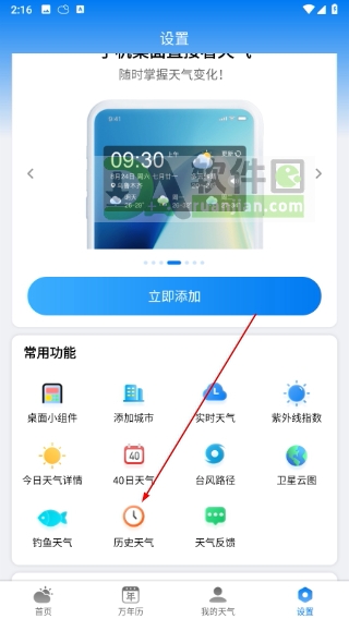 2、在设置菜单中找到并点击“历史天气”选项,进入查询界面;