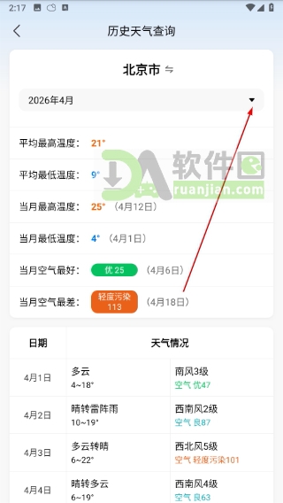 3、在历史天气页面,点击“月份”右侧的下拉箭头,展开时间选择器;