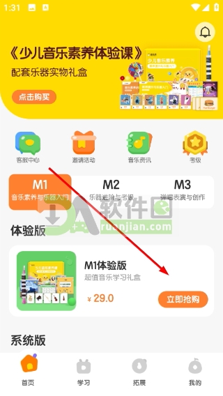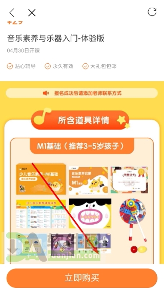 2、在详情页查看M1基础课程包含的学习内容与配套道具(如节奏卡、音符贴纸等),确认无误后点击底部【立即购买】;