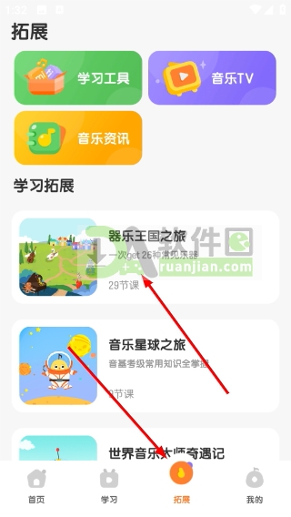 4、购买成功后,返回首页或进入“拓展学习”页面,即可在“学习工具”“音乐TV”等板块中找到已购课程,例如点击【器乐王国之旅】开始正式学习。