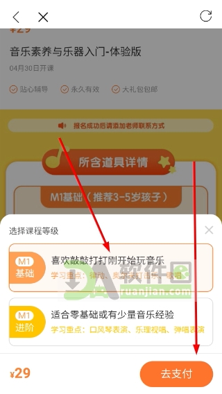 3、在弹出的课程等级选择界面,根据孩子年龄或音乐基础选择对应级别(如M1、M2等),核对信息后点击【去支付】完成订单;