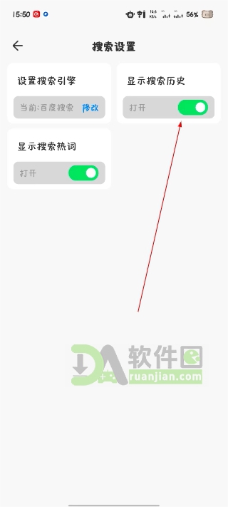 4、把“搜索历史”开关关掉,就不再显示过往记录了。