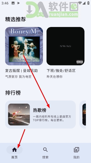1、打开首页就能看到精选歌单推荐,点“热歌榜”进去浏览当前最受欢迎的歌曲。