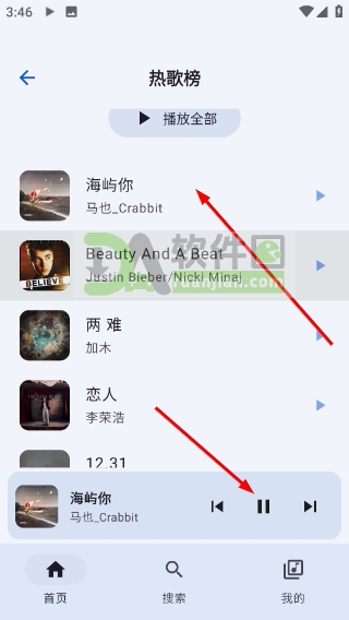 2、在榜单里挑一首想听的歌,点播放就行;也可以用底部控制栏随时暂停或换下一首。