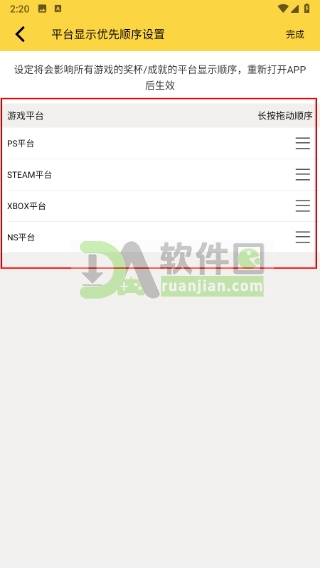 4、长按你想调整的平台图标,上下拖动来改变顺序,排好后点“完成”即可保存设置。