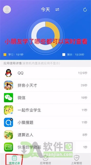 1、自动记录设备上所有应用的使用情况,帮助家长全面了解孩子的日常数字行为习惯。