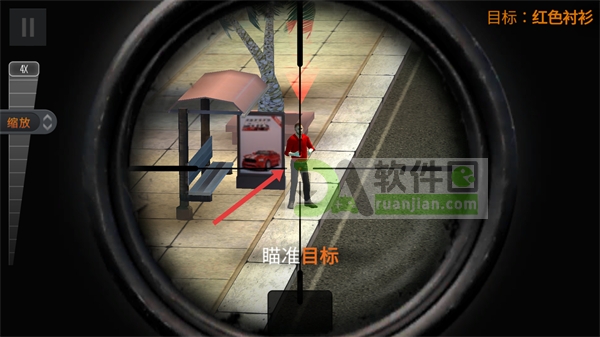2、进入瞄准模式后,按照指示【瞄准目标】,将十字准心对准身穿【红色衬衫】的对手,静候良机准备发射。