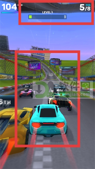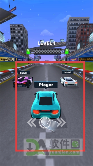 1、在LEVEL1的出发点界面,通过拖拽屏幕两侧控制赛车行驶,与其余竞争者一起开始竞速。