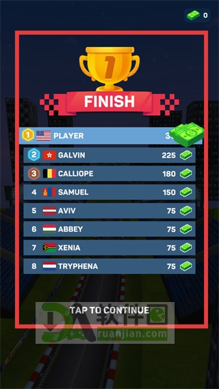 4、查看成绩统计界面,确定自己的排名与奖励,点击继续即可进入下一轮或回到主菜单。