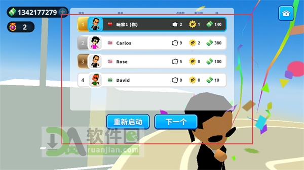 4、战斗结束后,查看结算排名,确认取得第1名,可选择重新开始或进入下一轮挑战。