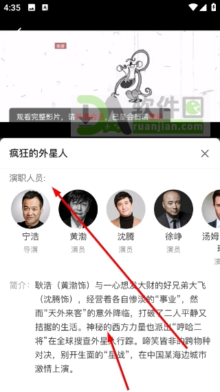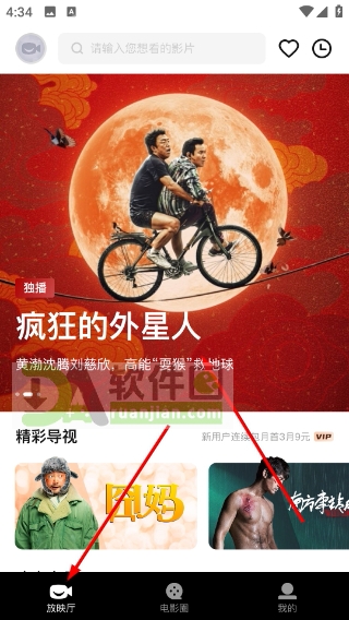 1、打开App后进入“放映厅”页面,点击任意影片封面(如《疯狂的外星人》),即可进入该影片的播放详情页。