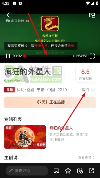 2、在播放页面,可拖动进度条自由调整播放位置;点击屏幕上的“简介”按钮(通常位于右上角或影片标题下方),即可查看影片详细信息。