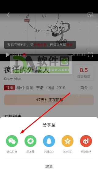 4、若想分享影片,点击“分享”按钮,选择微信好友、朋友圈或其他社交渠道,即可将影片链接发送给他人,轻松完成推荐。