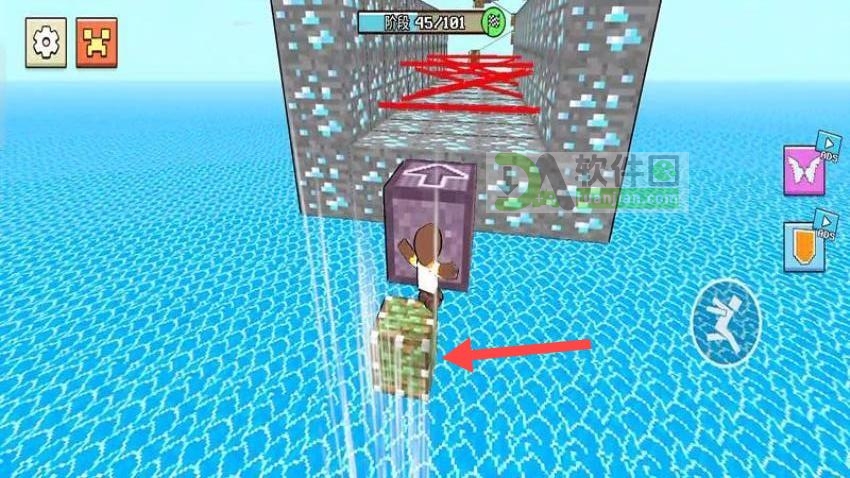 来到水域环境中,利用周围的辅助物品或者搭建方块,找到通往前方的合理路线。