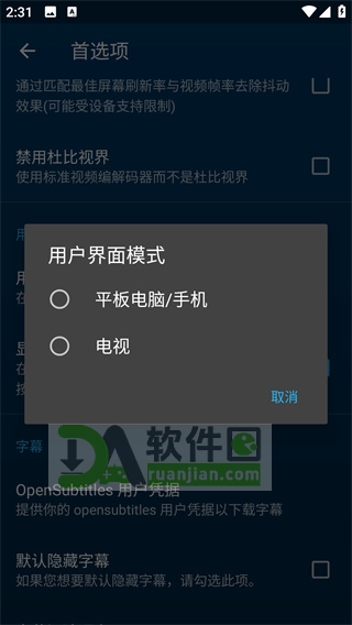 4、点开这个选项,选中“电视模式”,界面就会自动切换成适合大屏遥控操作的布局。
